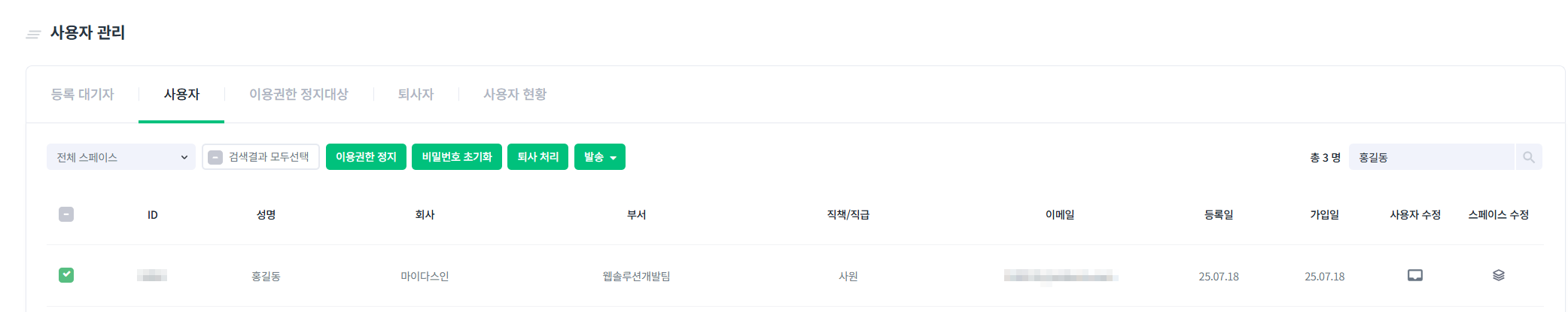- [사용자]탭에서 사용자를 선택하면 '이용권한 정지' 및 '퇴사 처리' 버튼이 활성화됩니다.