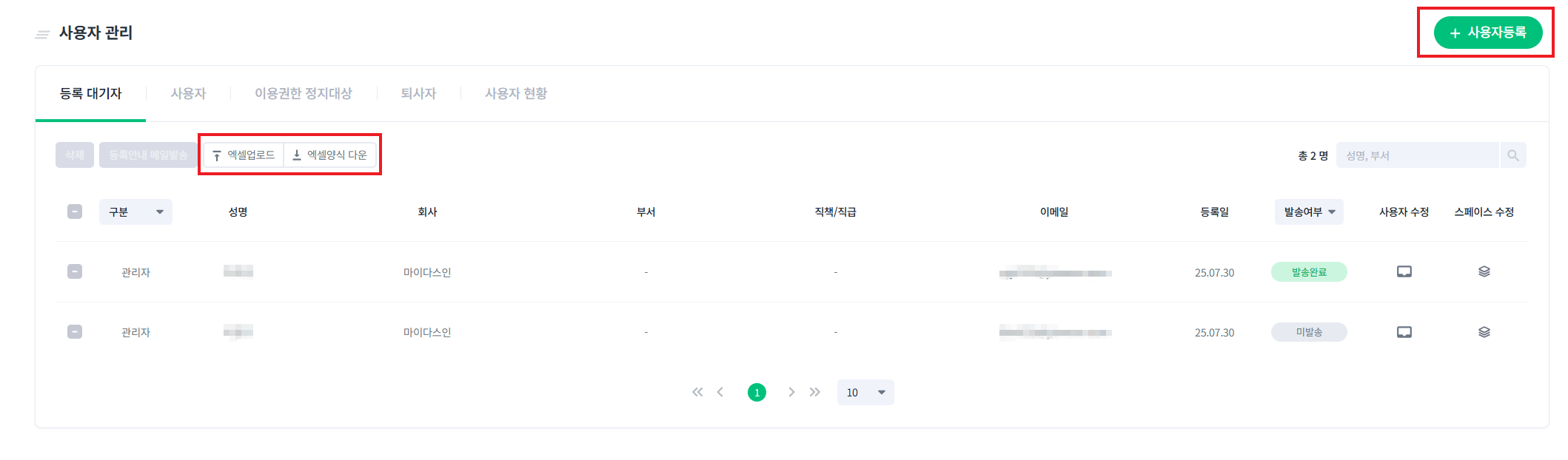 개별등록은 '사용자 등록' 버튼을 통해 진행 가능하며, 대량 등록은 '엑셀 업로드'를 통해 진행 가능합니다.