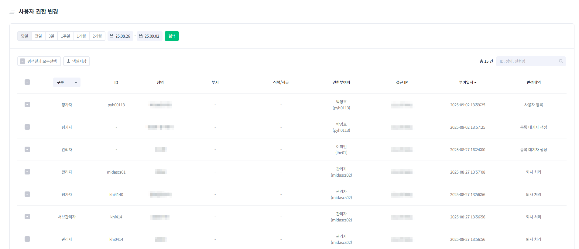 2025년 12월 5일 (금) [시스템 로그] 사용자 권한 변경 특정 계정에 대한 권한 변경 이력을 확인할 수 있습니다. 사용자 권한 변경 특정 계정에 대한 권한 변경 이력을 확인할 수 있습니다. 권한 부여자의 이름, 계정, 시간과 변경 대상을 확인할 수 있습니다. 사용자 권한 변경 이력