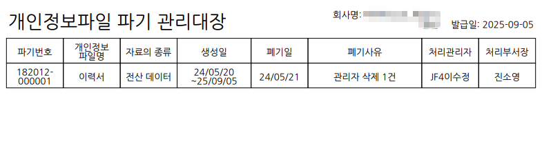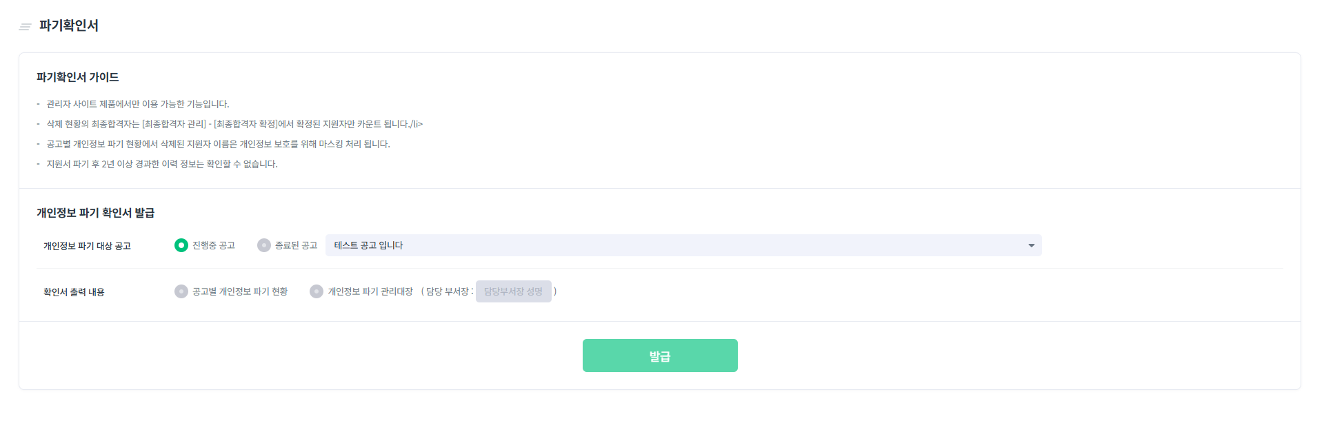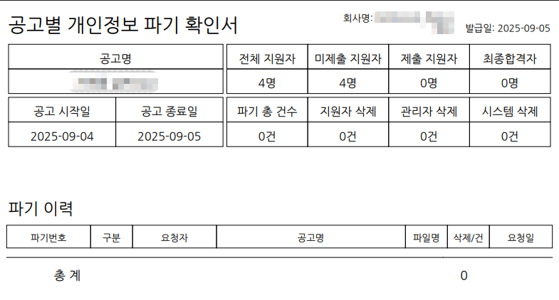 2025년 12월 5일 (금) [개인정보로그] 파기확인서 진행 중인 공고 또는 종료된 공고에서 지원서가 삭제된 내용에 대한 확인서를 발급받을 수 있습니다. 파기확인서 진행 중인 공고 또는 종료된 공고에서 지원서가 삭제된 내용에 대한 확인서를 발급받을 수 있습니다. 또한 공고별 개인정보 파기 현황 또는 개인정보 파기 관리대장에 대한 확인서를 출력할 수 있습니다. 개인정보로그 파기 확인서 발급 개인정보 파기 관리대장 예시 공고별 개인정보 파기 현황 예시