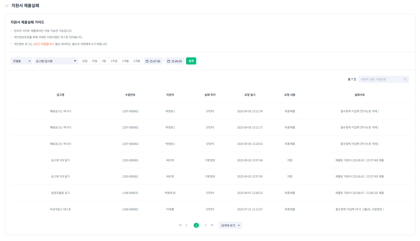 2025년 12월 5일 (금) [개인정보로그] 지원서 제출실패 원자가 지원서 제출 실패 시, 실패 사유를 확인할 수 있습니다. 지원서 제출실패 지원자가 지원서 제출 실패 시, 실패 사유를 확인할 수 있습니다. 개인정보보호를 위해 삭제된 지원자명은 마스킹 처리됩니다. 지원서 제출 실패 사유 ℹ️ TIP 시스템 오류를 주장하는 지원자에게 정확한 실패 사유를 확인, 제공할 수 있습니다.