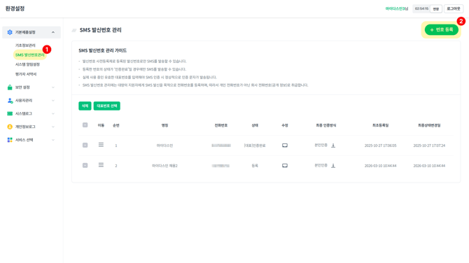 [환경설정] > [기본제품설정] > [SMS 발신번호관리]