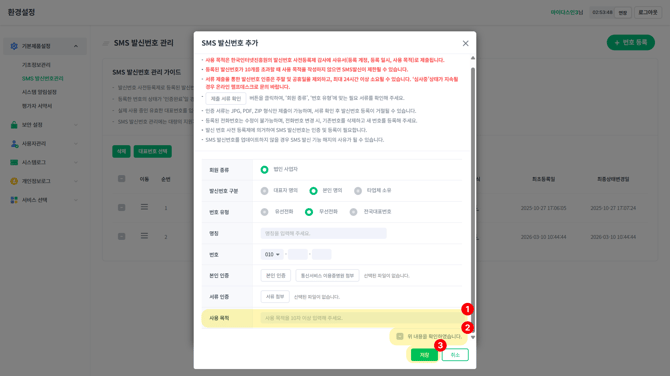 발신번호 사전 등록제에 따라 발신번호 사용 이력 및 목적 관리