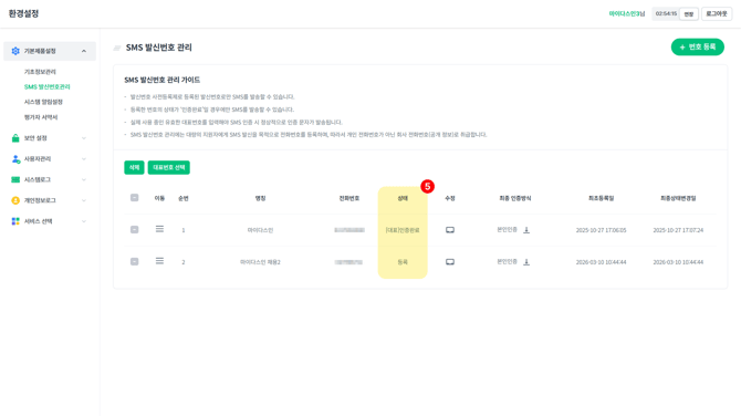 5) 승인 이후 [상태] 열이 [등록] → [인증완료] 상태로 변경되면 SMS 발송 및 사용 가능