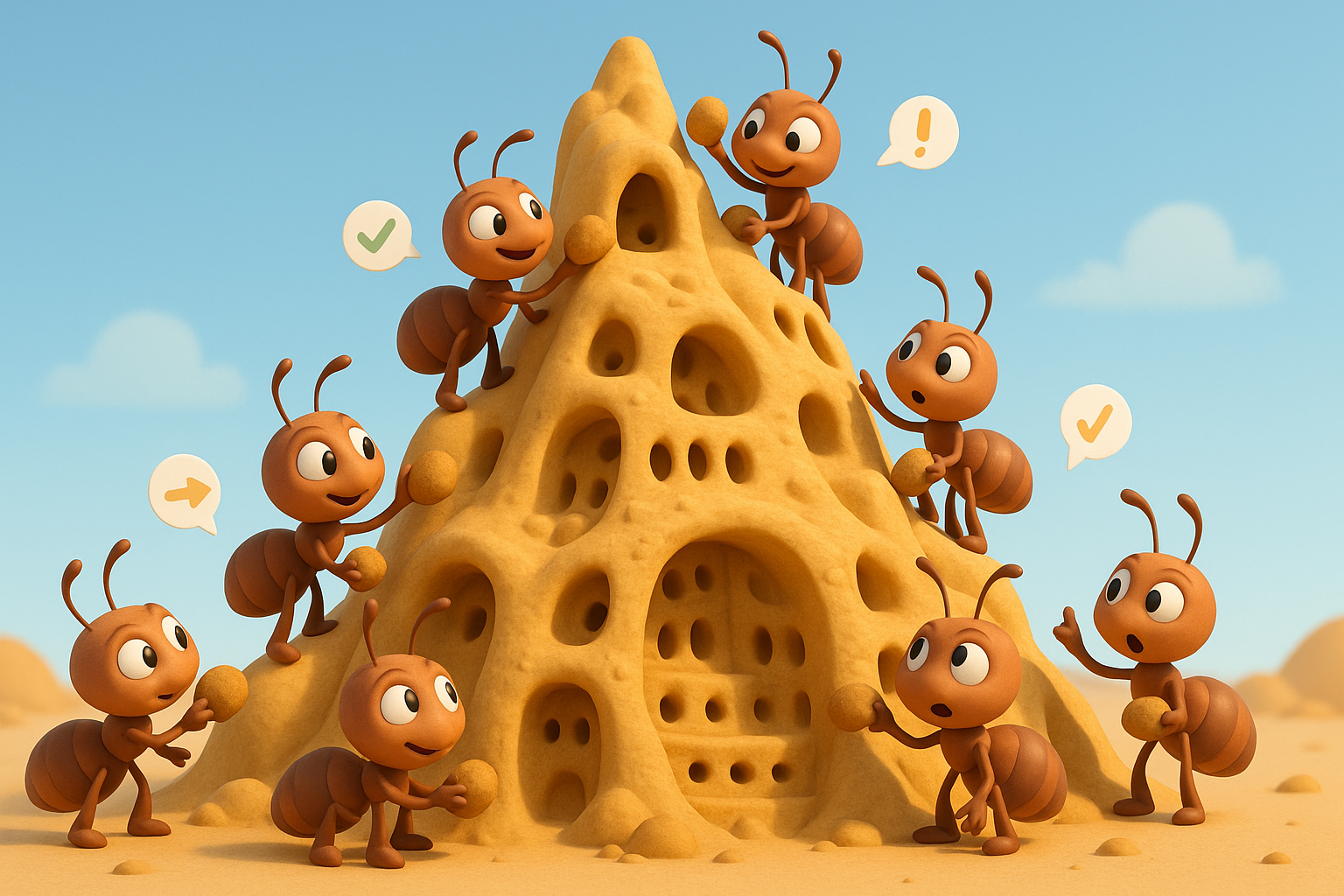 흰개미집 건축을 다시 떠올려보세요. 각 개미는 다른 개미들이 흙을 파는 곳으로 모여들고, 그곳에서 판 흙을 주변에 쌓습니다(상호작용). 이 단순한 행동이 반복되면서 작업 지점이 소수로 집중되고, 그 주변에 흙이 규칙적으로 쌓이기 시작합니다(패턴). 패턴이 강화되면서 터널, 방, 램프 등 정교한 구조가 형성됩니다(질서). 그 결과 개별 개미의 행동에는 없던 특성, 즉 온도와 습도를 조절하고 포식자를 막아내는 기능이 흰개미집이라는 구조 전체에서 생겨납니다(창발).